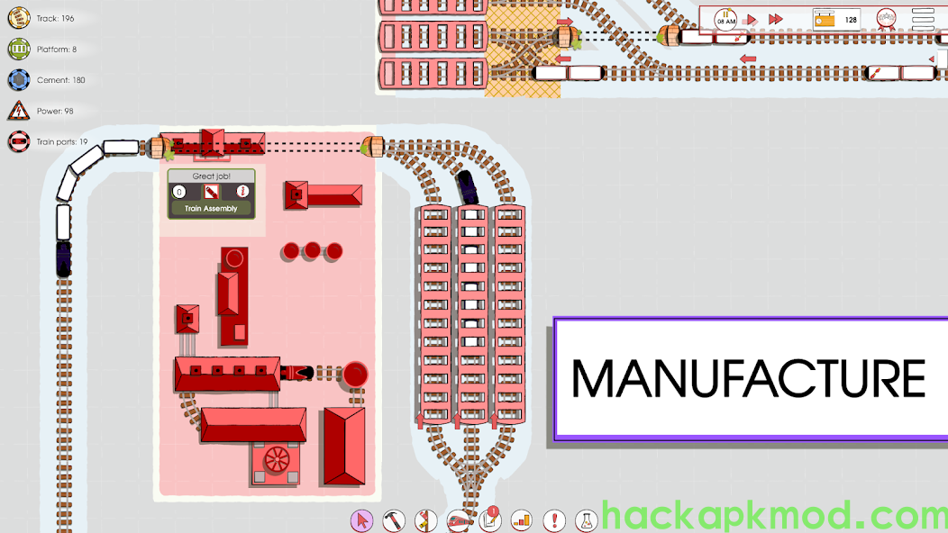 Iron Roads is a top-down 2D train management game in which you lay tracks, buy trains, and set their routes until you have an efficient network carrying passengers and cargo between your towns and factories.